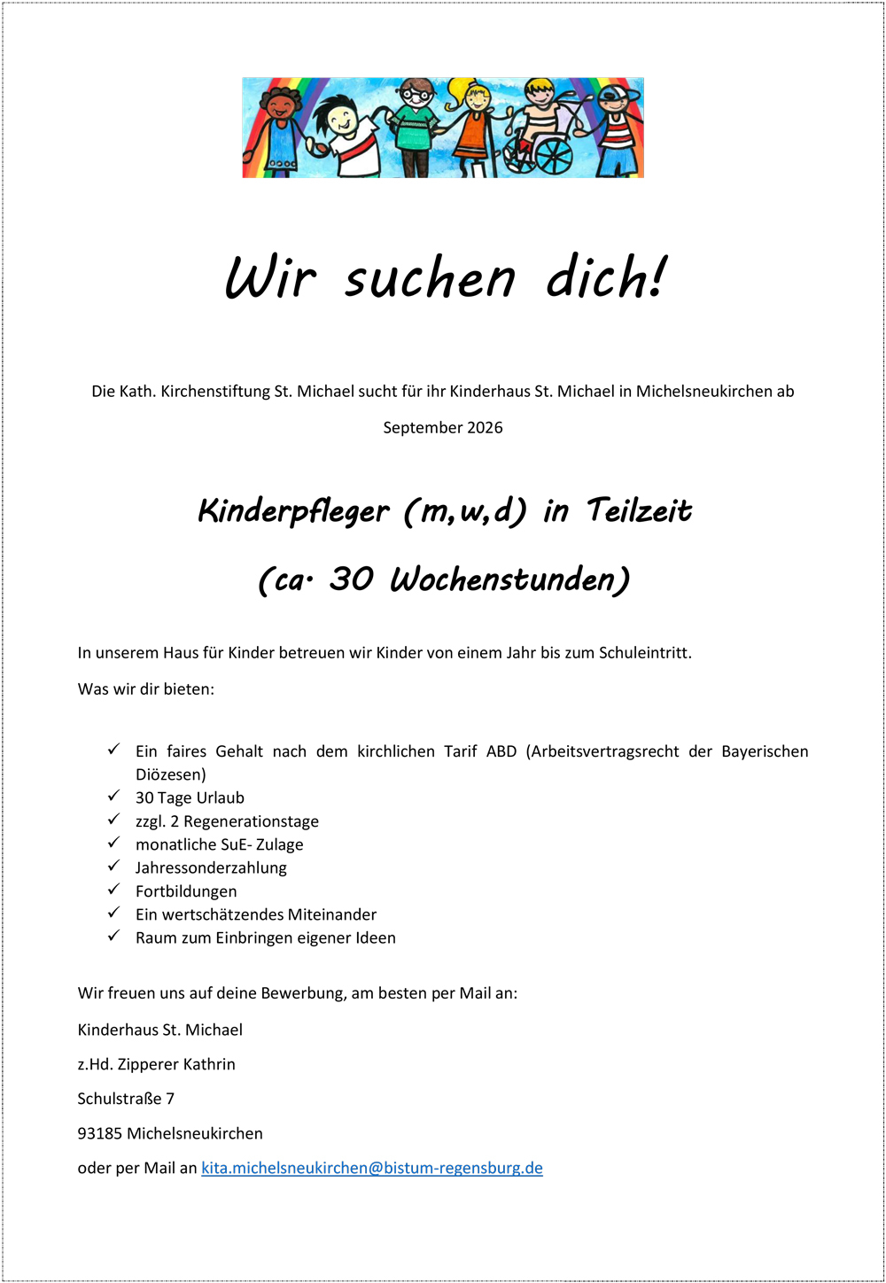 Wir suchen ab September 2026 Kinderpfleger (m,w,d) in Teilzeit (ca. 30 Wochenstunden)